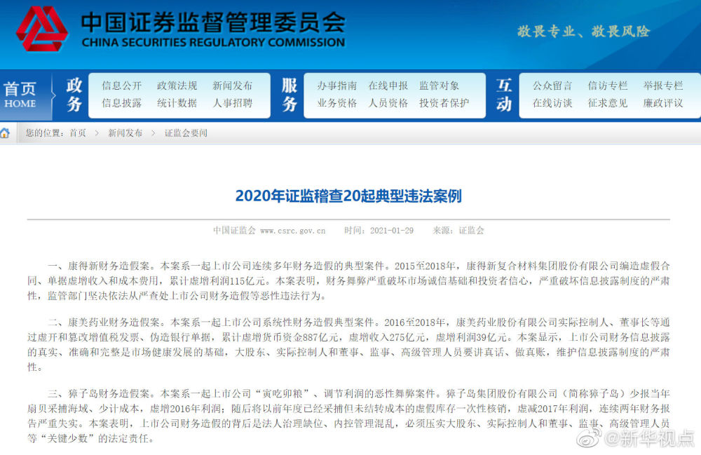 【证监会年度黑榜 20起大案中财务造假案最多】还记得獐子岛爱“捉迷藏”的扇贝吗?出来造假是要还的。证监会近日发布“年度黑榜”,獐子岛、康得新、康美药业等20起市场影响恶劣的大案上榜。其中,6起典型案例涉及财务造假,占比最高。这个占比之高也是近些年来罕见的。