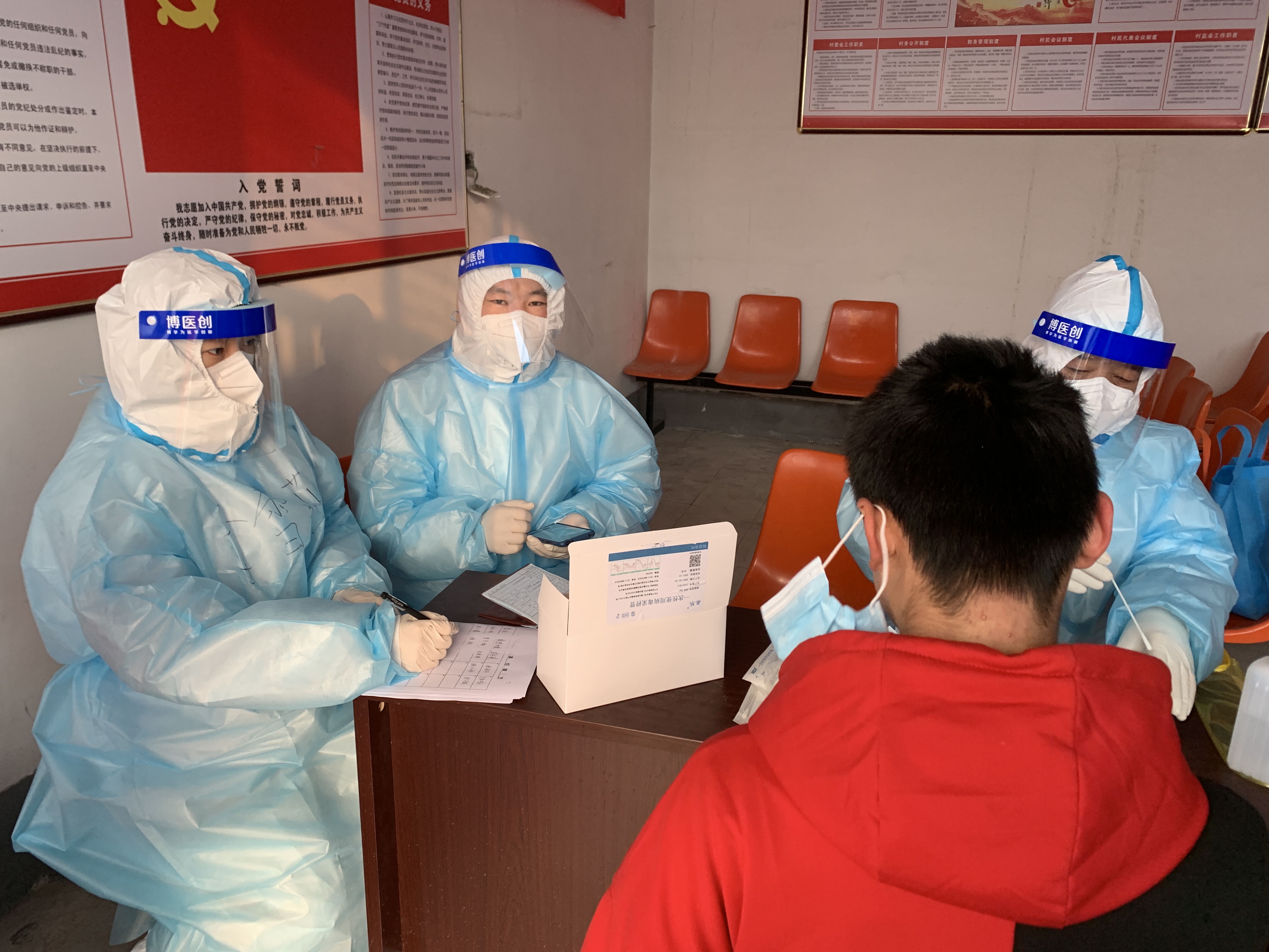 1月23日,在石家庄新乐市协神乡笔头村,身穿防护服的李雪菲(左一)为做核酸检测的村民登记。(受访者供图)