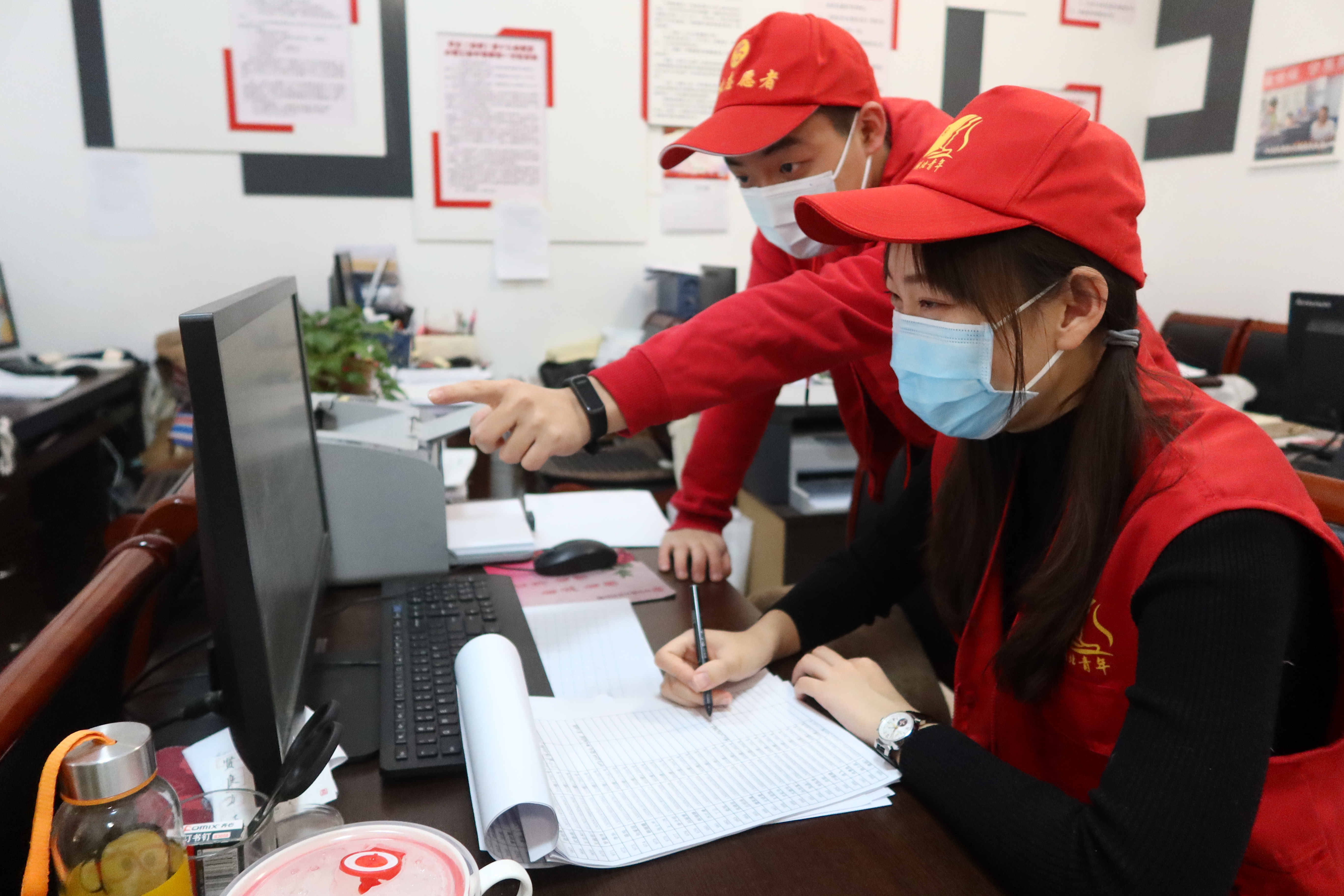 1月30日,志愿者褚梓淇和小伙伴一起对返唐报备的人员信息进行认真核实校对。(受访者供图)
