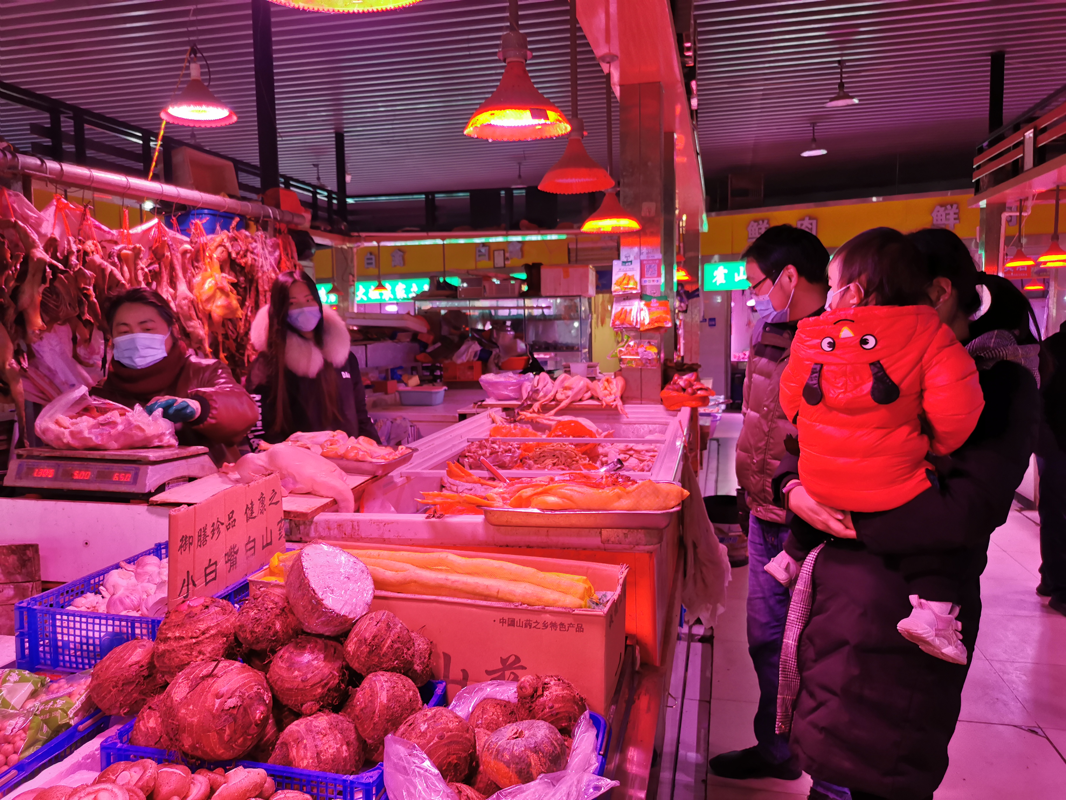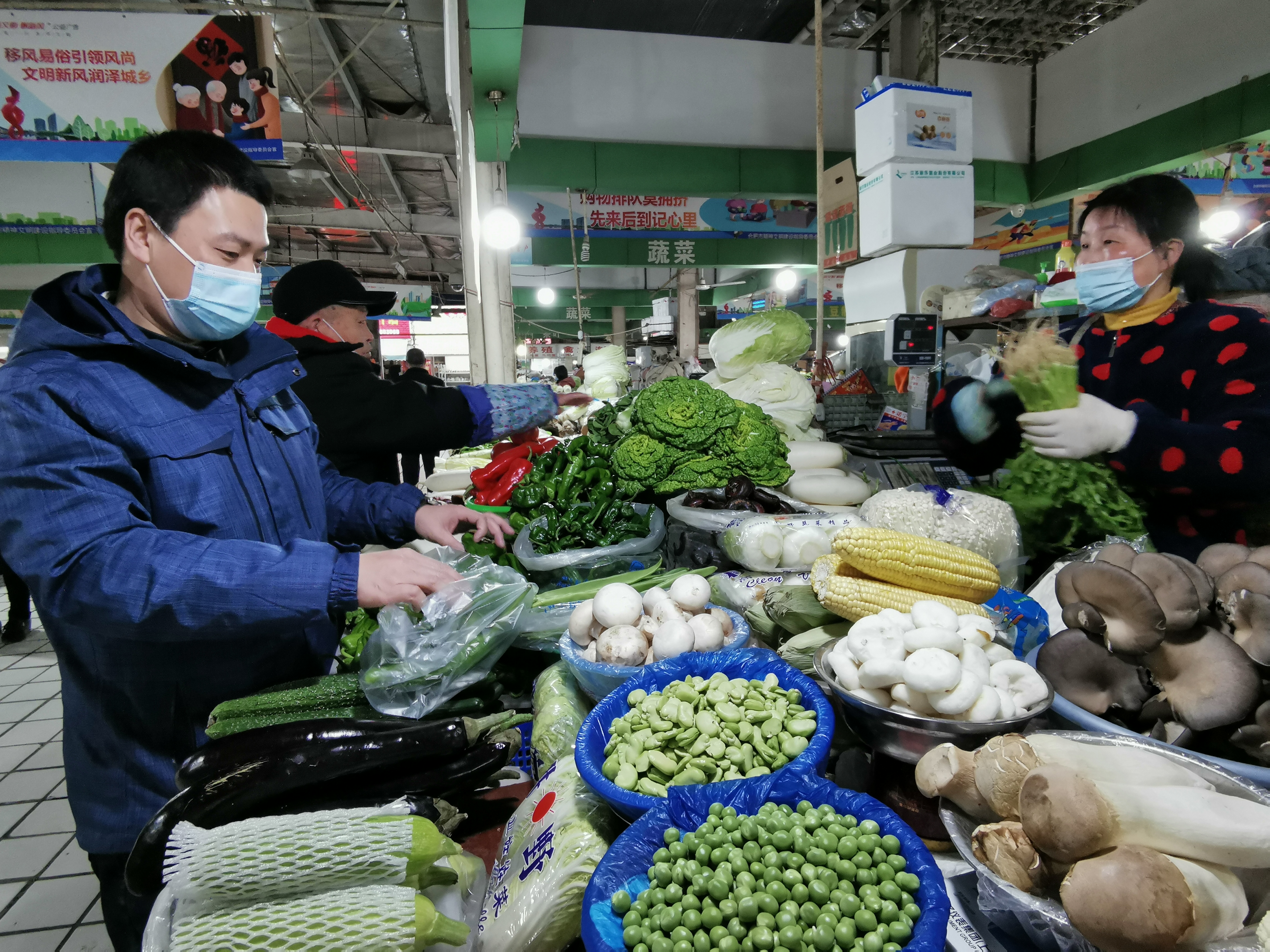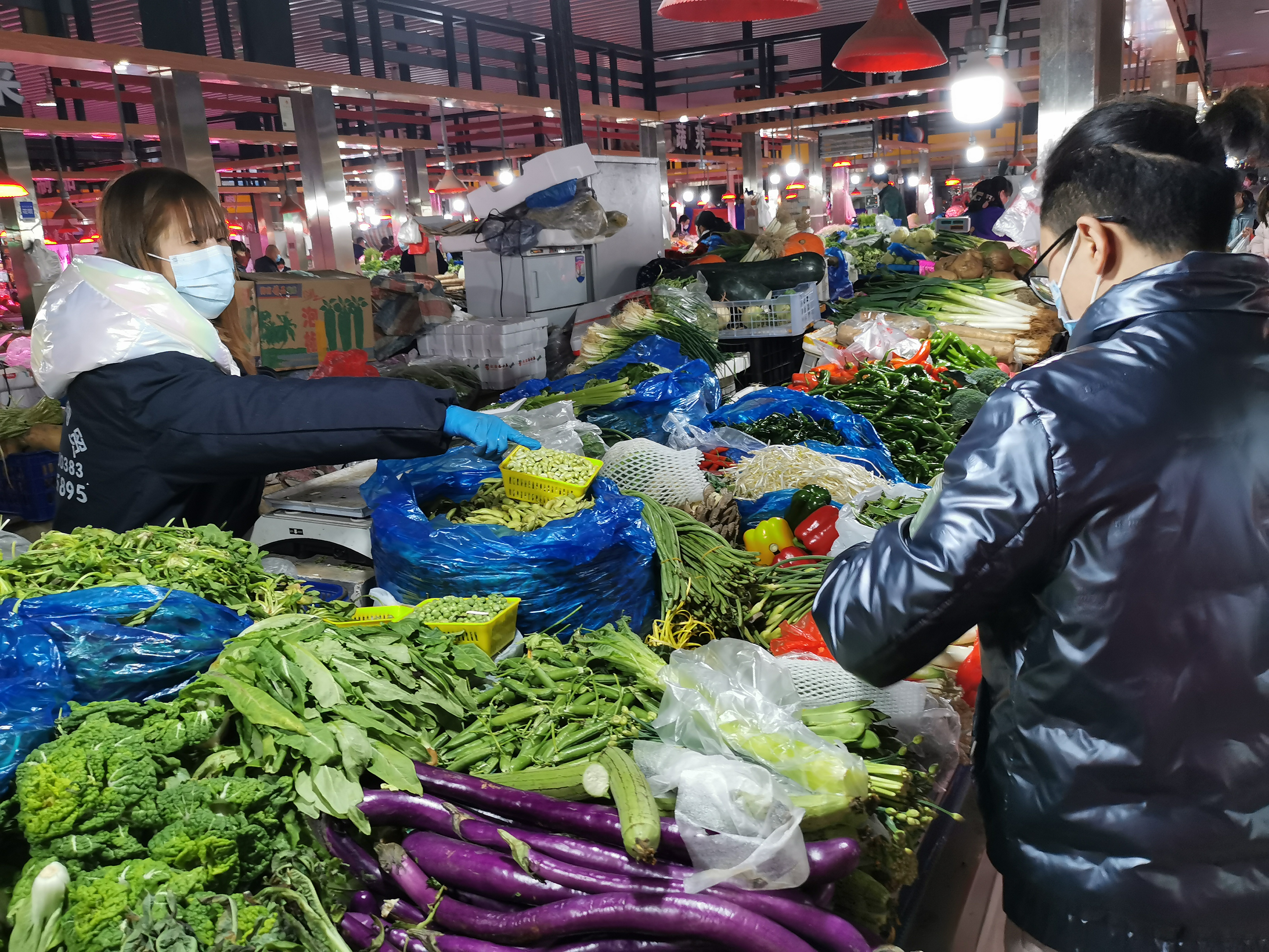 傍晚5点,“晚高峰”即将到来,市民们排队扫码、测温后进入市场,市场里灯光温暖、舒适整洁、秩序井然。