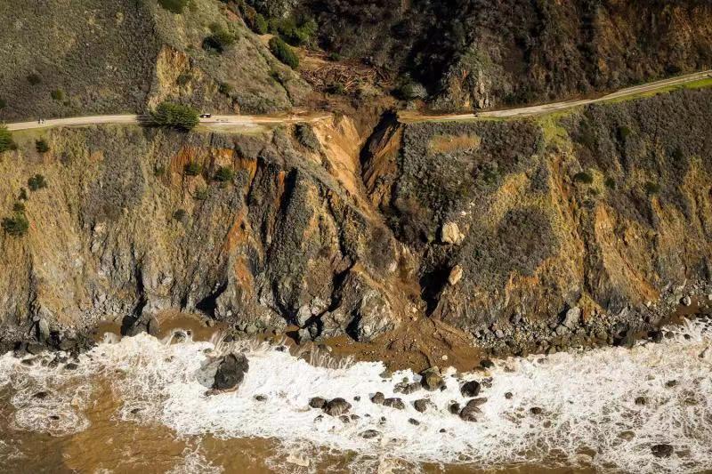 据加州蒙特利县警长办公室最新公布的无人机录像显示,因遭受冬季暴风雨连日冲刷,加州一号公路的大苏尔段被泥石流冲毁,路面坍塌滑落至太平洋中。事故发生在加州一号公路大苏尔段卡梅尔以南约72公里(45英里)处,断口跨越了整个路面,双向车道均被毁坏。