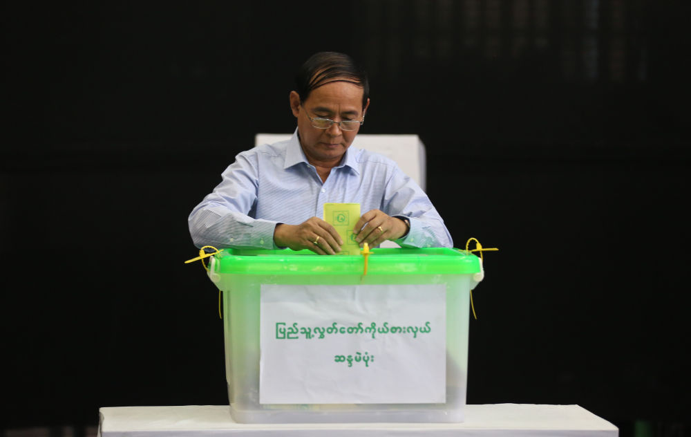 2018年11月3日,在缅甸仰光,缅甸总统温敏在一处投票站投票。新华社发(吴昂摄)
