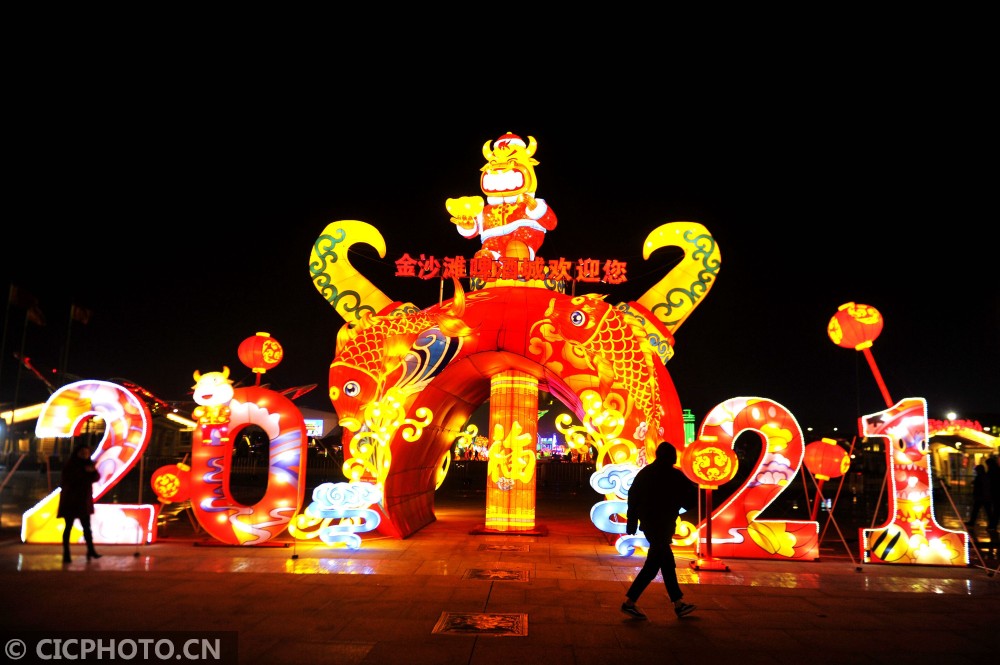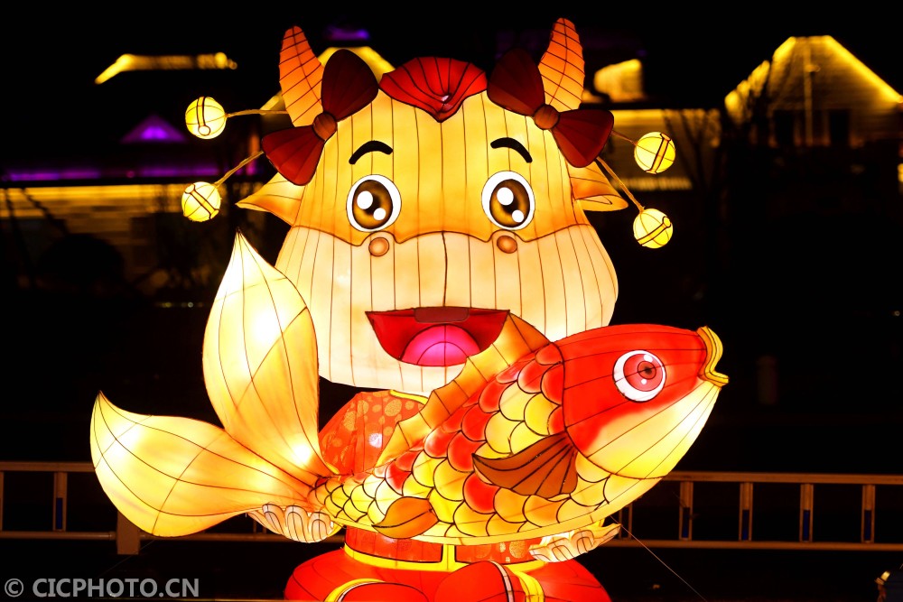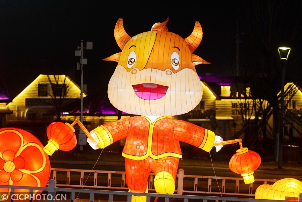 新春临近,山东青岛西海岸新区金沙滩啤酒城以十二生肖为主题的花灯造型丰富有趣,尤其多种牛花灯格外引人注目,吸引市民前来观赏。