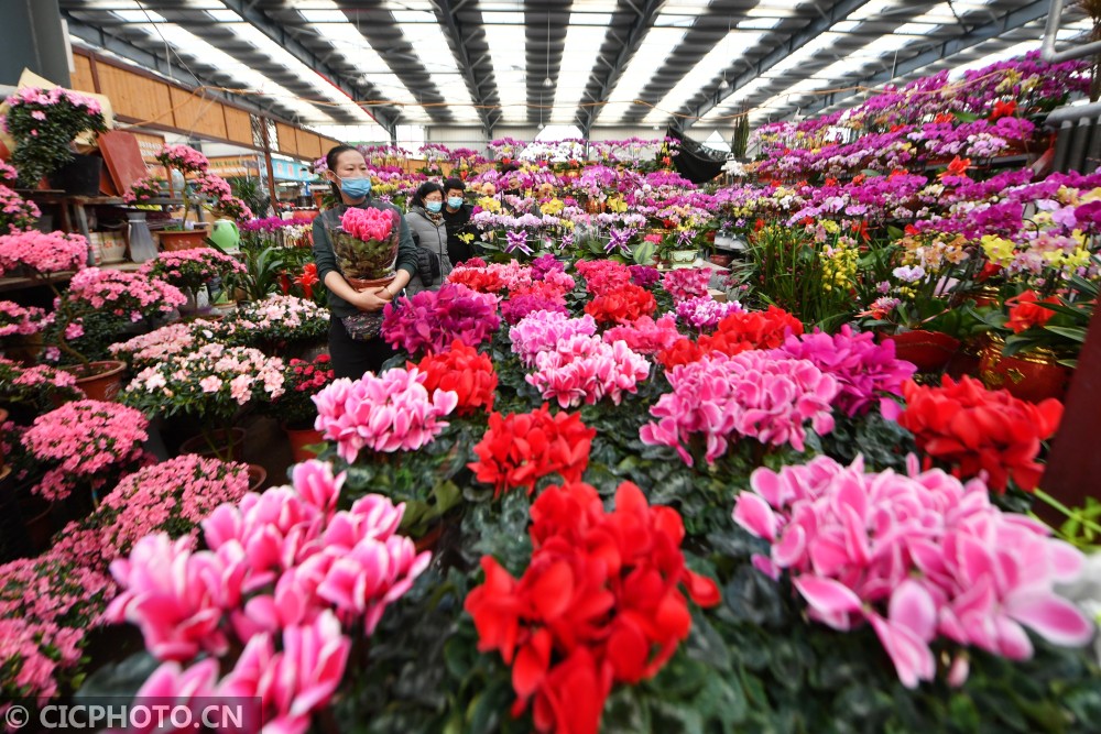 春节临近,山东省青岛市花木市场摆放的盆栽花卉满厅盛放,透露出浓浓的春意。人们来此选购年宵花卉装扮居室,迎接即将到来的牛年新春。