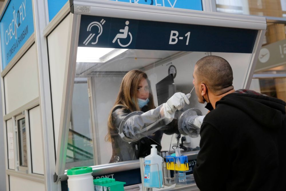 1月24日,在以色列本古里安国际机场,工作人员在快速新冠病毒检测点为旅客进行取样。(新华社发,吉尔·科恩·马根摄)