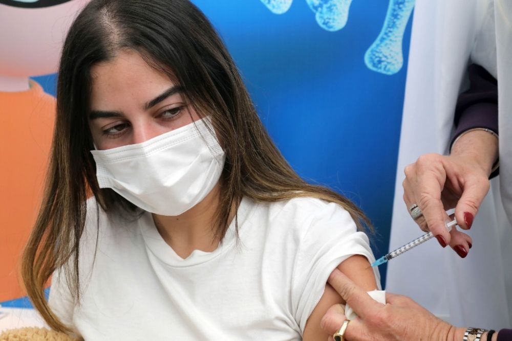 1月23日,在以色列特拉维夫一处卫生服务站内,一名女孩接种新冠疫苗。(新华社/基尼图片社)