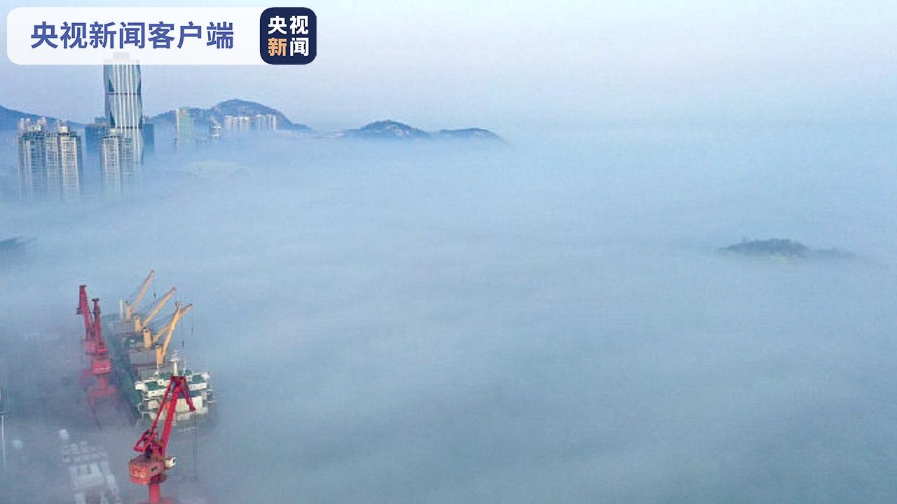 1月31日,连云港东部城区海边出现平流雾景观,整个海滨城山峦、港口、海岛、楼宇在平流雾中若隐若现,宛如海市蜃楼。