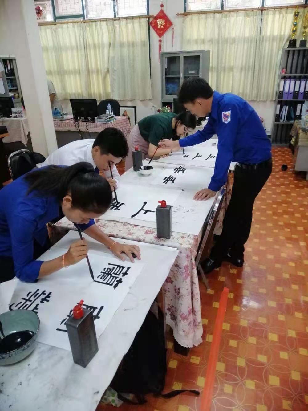 留学生普娜(左一)在练书法。图片由受访者提供