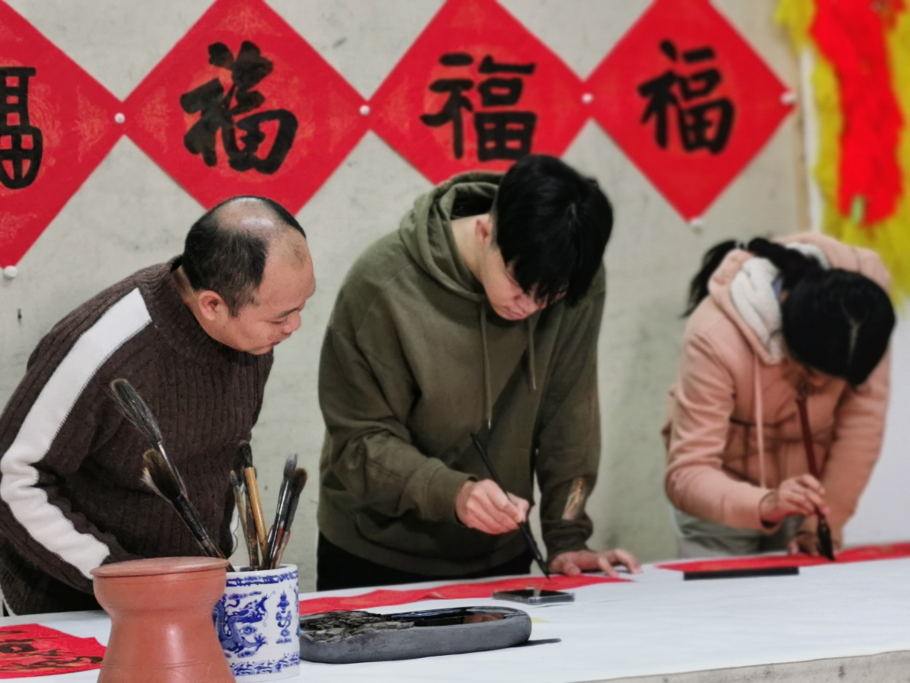 留学生宏裕(中)参加书法活动。受访者提供