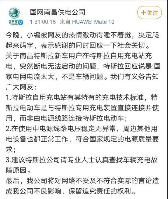 1月31日,国网南昌供电公司发布声明称,特斯拉电动车是与特斯拉专用充电装置直接连接并使用,在使用中电源线路电压稳定无异常,符合国家规定的电源质量要求;建议特斯拉公司请专业人士认真查找车辆充电故障原因。