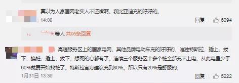有网友表示,自己的特斯拉也曾遭遇过充电不顺利的事情,“高速服务区上的国家电网,其他品牌电动车充得好好的,唯独特斯拉,插上、拔下、换桩,连续三个服务区十多个桩全部充不上电。从此电量少于60%就要开始找桩了。”