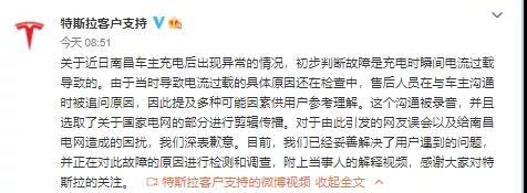 2月1日,“特斯拉客户支持”发布微博,对南昌电网致歉,称当时导致电流过载的具体原因还在检查中,“对于由此引发的网友误会以及给南昌电网造成的困扰,深表歉意。”