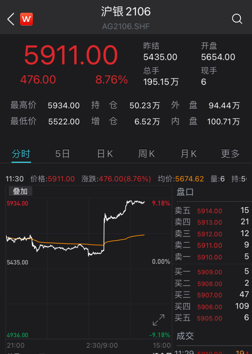 截至北京时间11:30,COMEX白银期货主力合约涨6.99%,报28.795美元/盎司;沪银期货主力合约涨8.76%,报5911元/千克。
