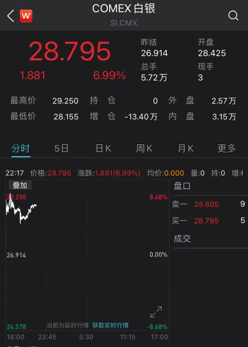 据Wind数据,COMEX白银期货主力合约盘中一度涨至8.68%,站上29美元;与此同时,沪银开盘大涨,涨幅最高升至9.18%。