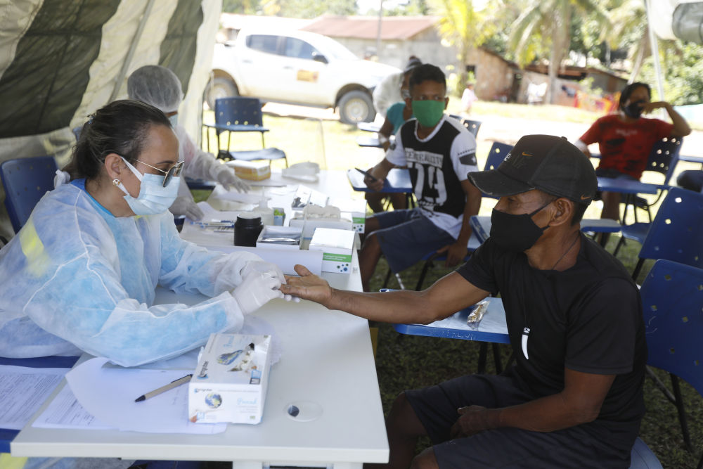 2020年12月10日,医护人员在巴西亚马孙州为一名原住民提供医疗服务。(新华社发,卢西奥·塔沃拉摄)