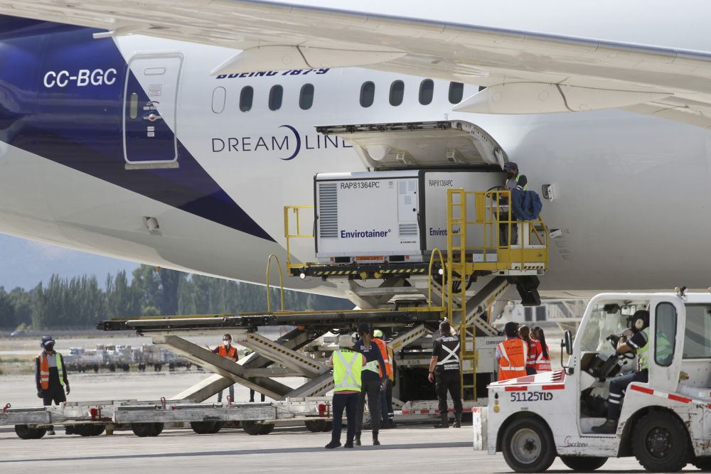1月31日,第二批中国科兴公司生产的新冠疫苗运抵智利首都圣地亚哥国际机场。(新华社发,智利卫生部供图)