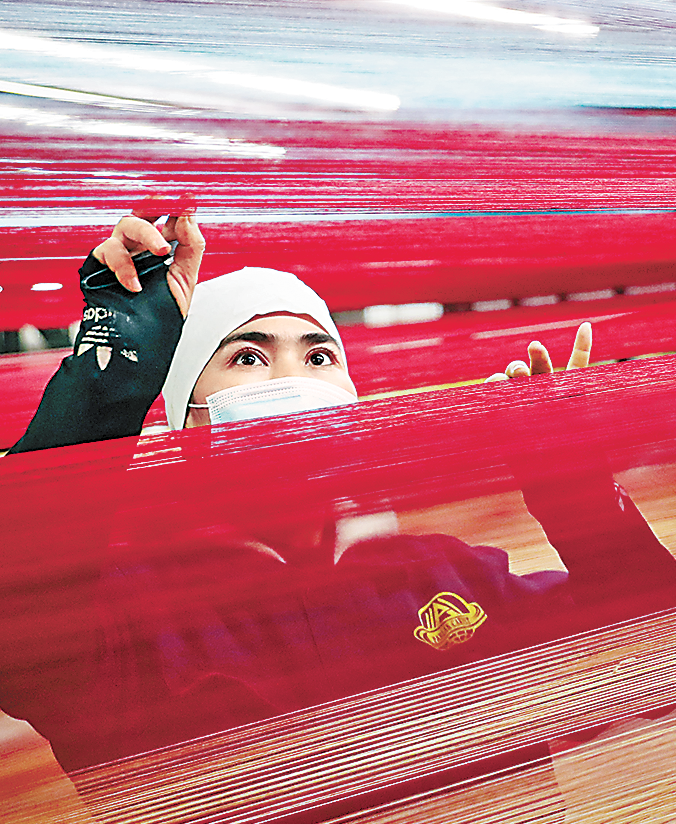 (图为乌鲁木齐市经开区(头屯河区)新疆地毯产业示范园帕尔拉克地毯厂生产车间,挡车工在连接地毯纺线。张秀科摄 图片来源:人民日报2020.12.09第13版)