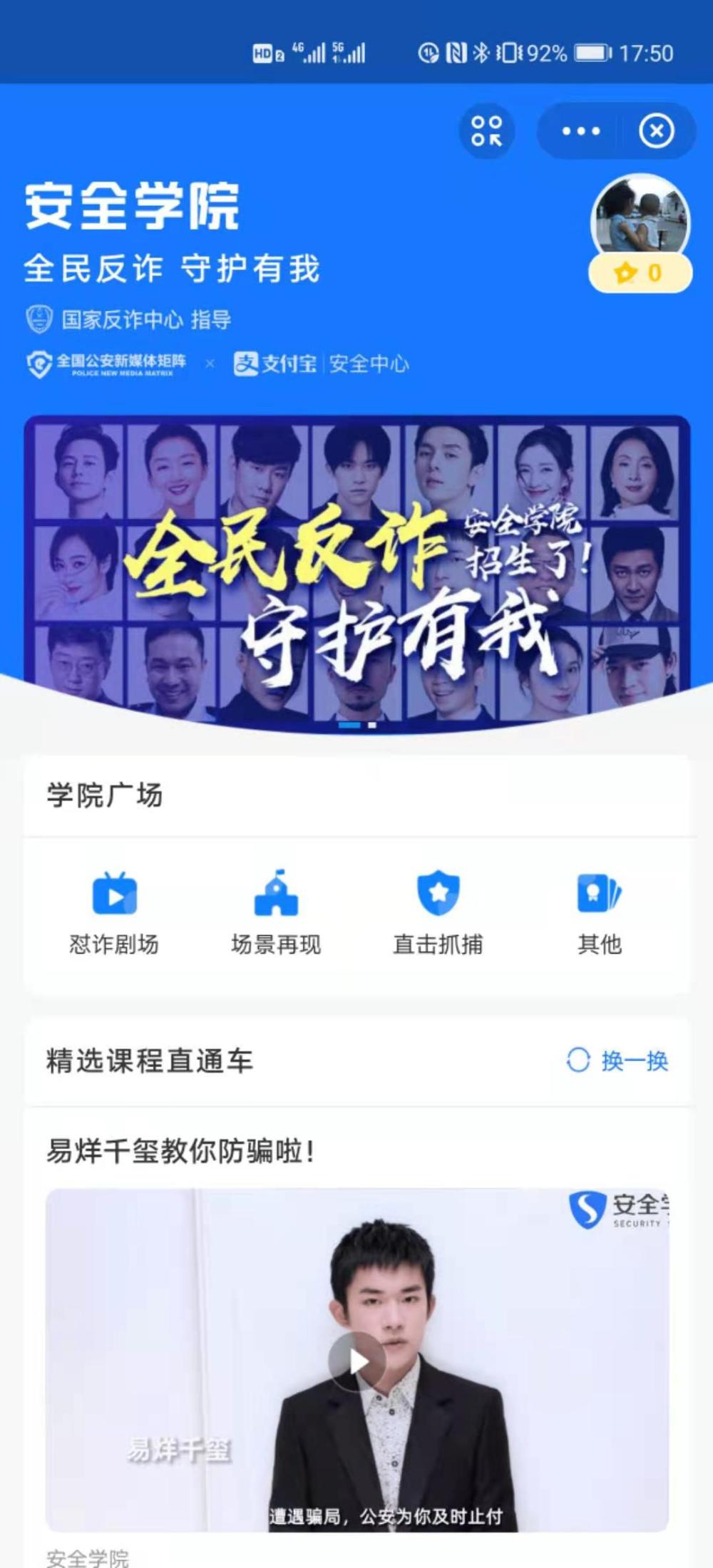 据介绍,“安全学院”于2020年9月试运营以来,已开展多场直播,覆盖逾4000万人次,全网话题超2亿。正式上线后,用户只需在支付宝搜索“安全学院”,即可进入安全学院反诈公益小程序。安全学院通过短视频、反诈防骗必修课云上课堂、防骗答题专场等兼具趣味性及知识性的方式,向网友介绍网络电信诈骗常见的杀猪盘、贷款诈骗、刷单诈骗等十多种诈骗形式,解密骗子的“话术”和手法,协同公安机关帮助用户树立防骗意识,降低诈骗案件发案率。