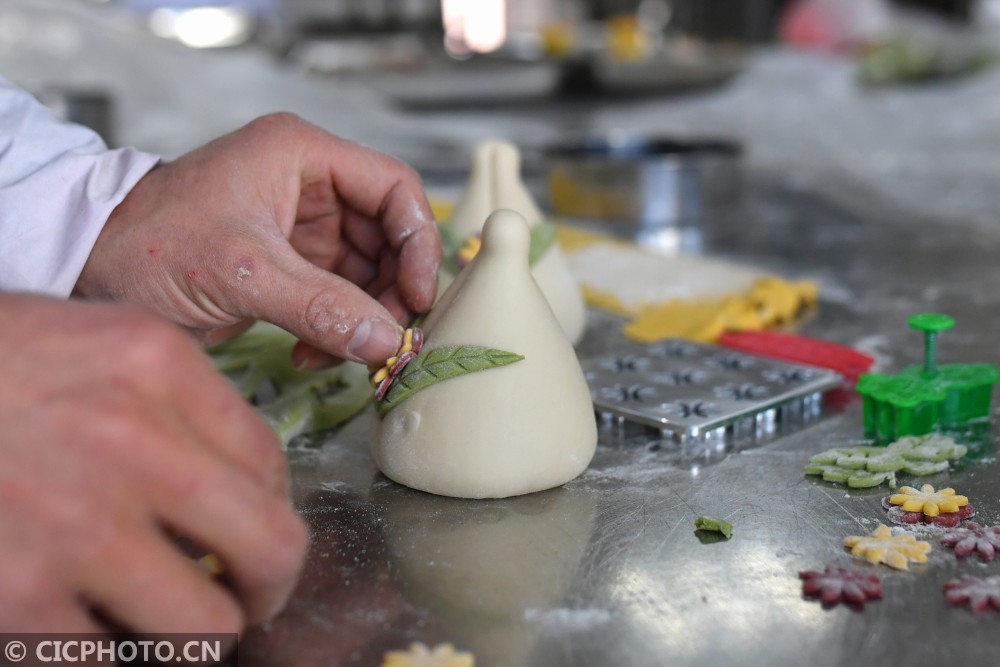 ↑2021年1月31日,山东省青岛市城阳区流亭街道,一名面塑师傅在为定制的生日寿桃大馒头贴花。CICPHOTO/王海滨 摄