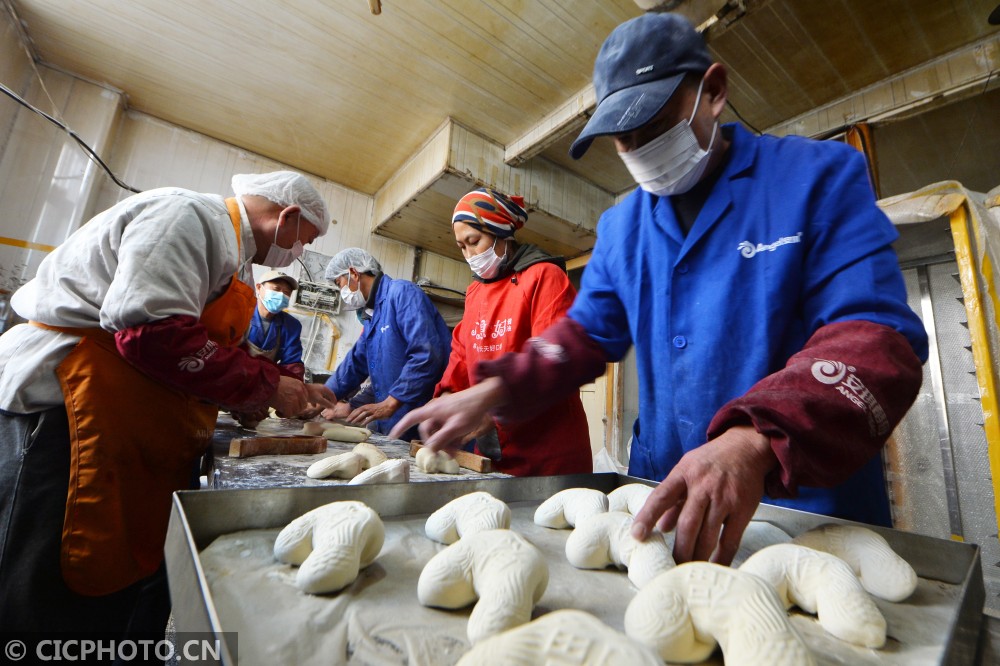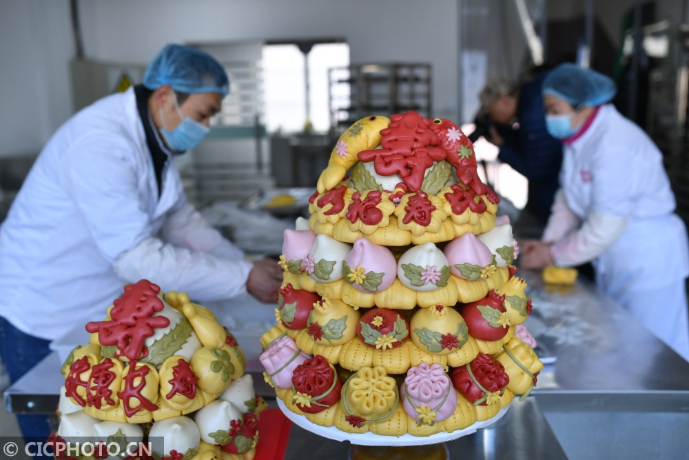 ↑2021年1月31日,山东省青岛市城阳区流亭街道,两名面塑师傅在赶制顾客定制的生日馒头。CICPHOTO/王海滨 摄