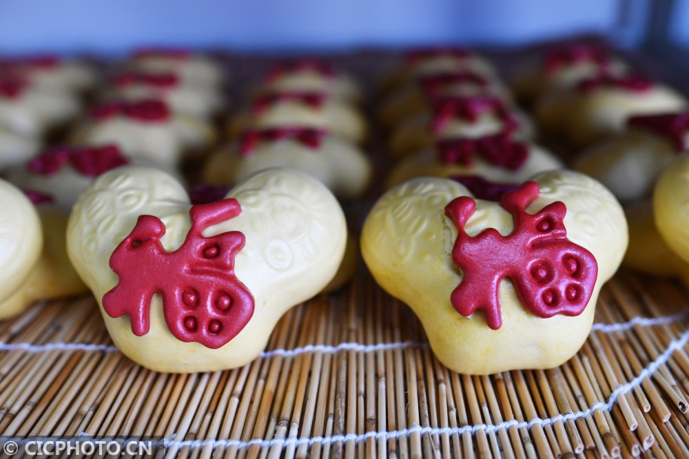 ↑2021年1月31日,这是在山东省青岛市城阳区流亭街道一家非遗馒头加工店拍摄的“福元宝”馒头。CICPHOTO/王海滨 摄