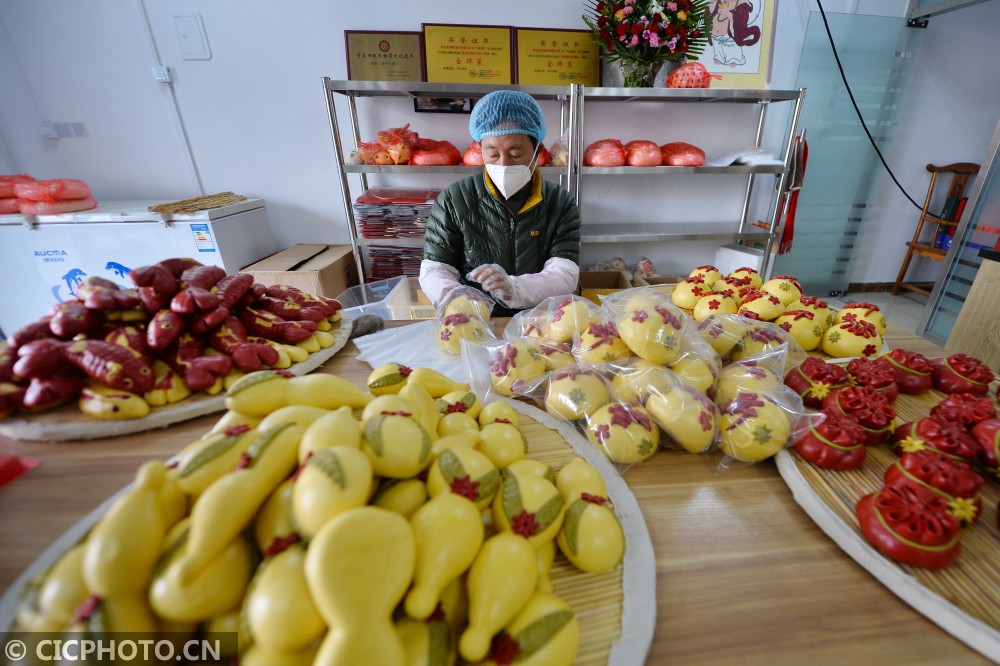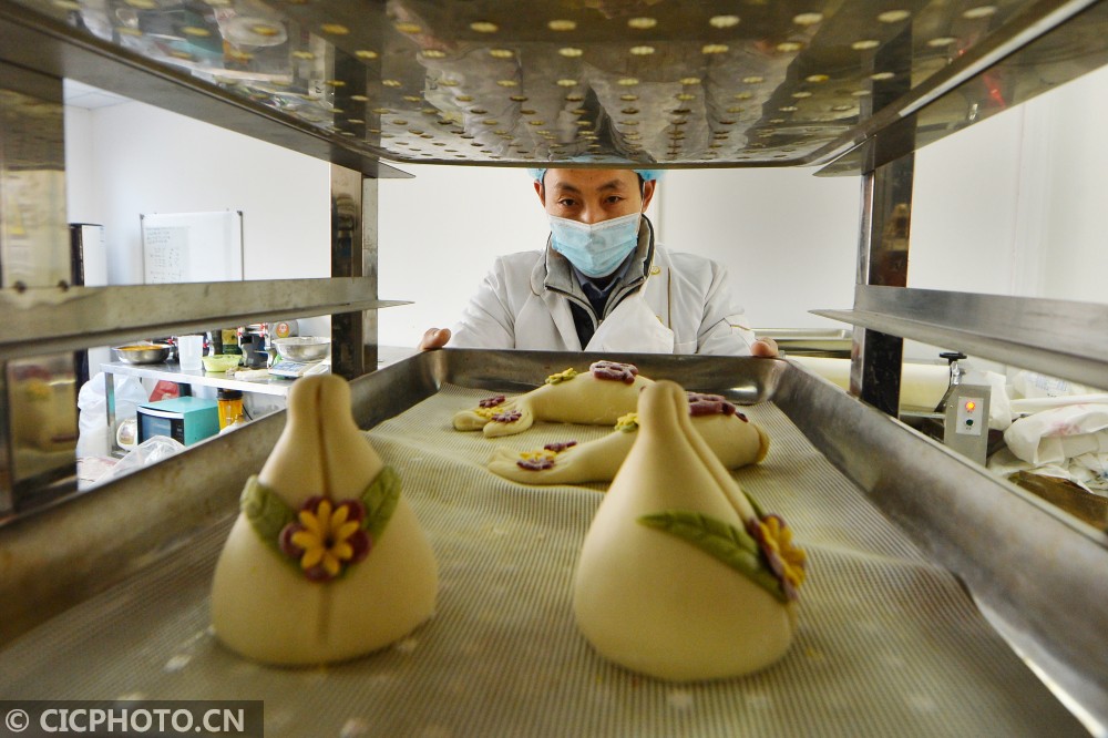 ↑2021年1月31日,山东省青岛市城阳区流亭街道,一名面塑师傅将制作好的果蔬寿桃面团摆放醒发。CICPHOTO/王海滨 摄
