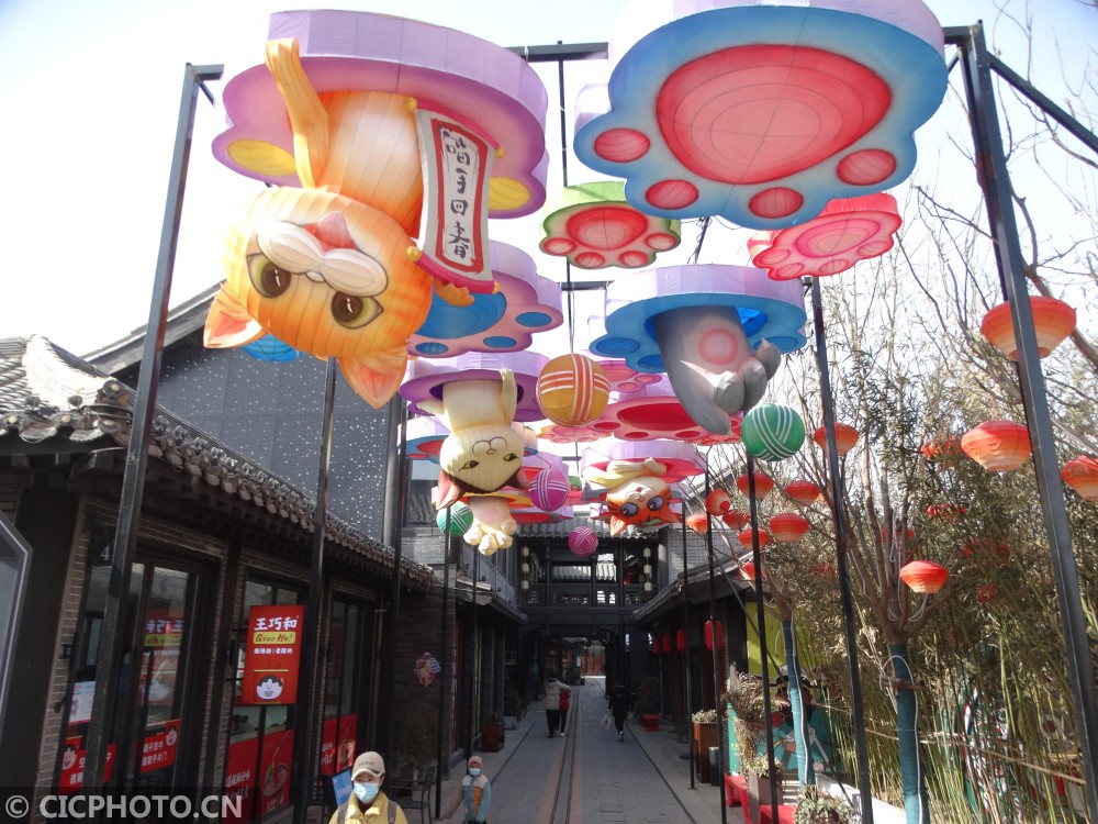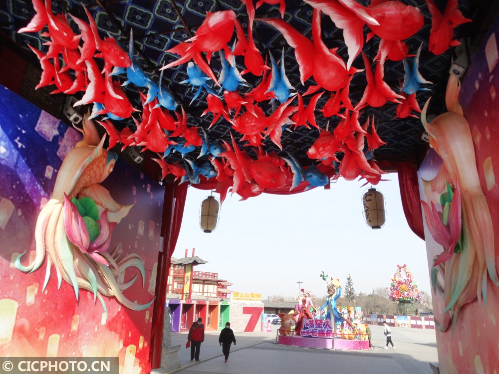 ↑2021年1月29日,游客在河南省开封市七盛角布置的彩灯造型景观前走过。CICPHOTO/李俊生 摄