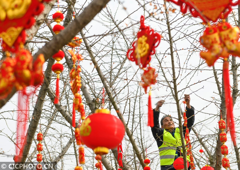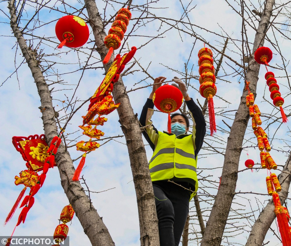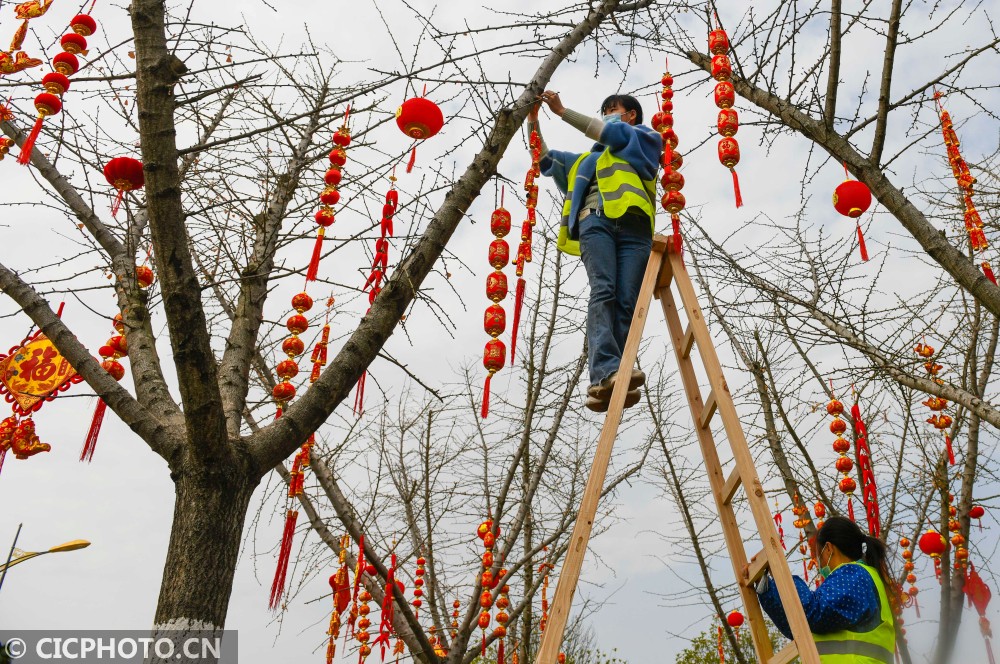 ↑2021年1月29日,在湖南省永州市道县月岩西路,园林工人在树上悬挂新春喜庆饰品。CICPHOTO/蒋克青 摄