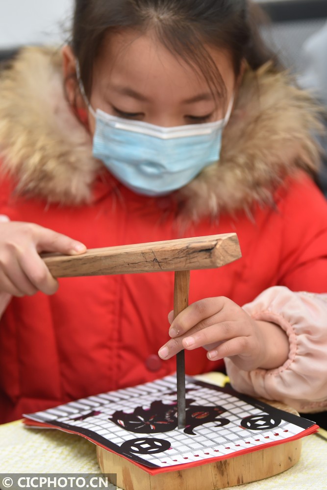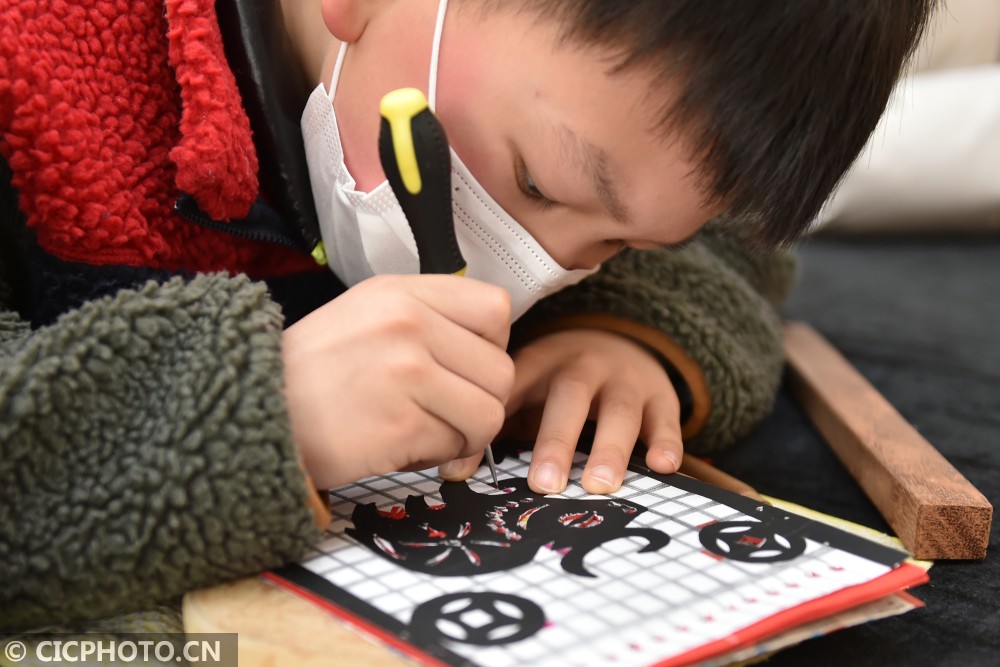 ↑2021年1月31日,江苏省南京市江宁区秣陵街道胜太社区,一名小朋友在展示自己刻制好的门笺。CICPHOTO/方东旭 摄