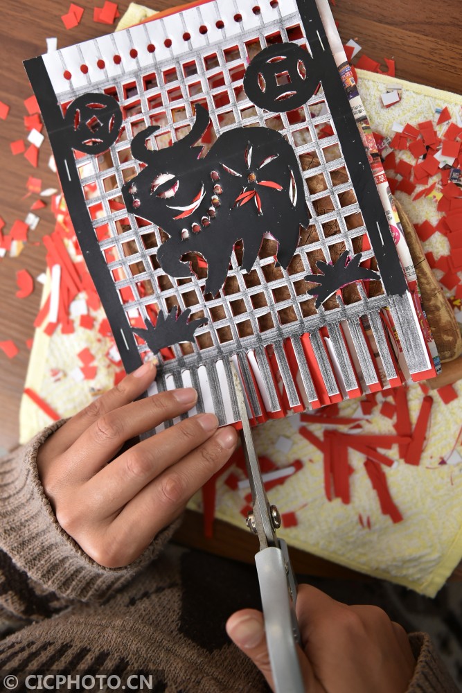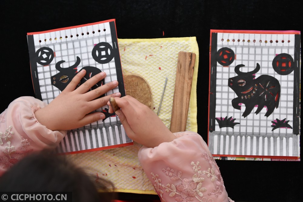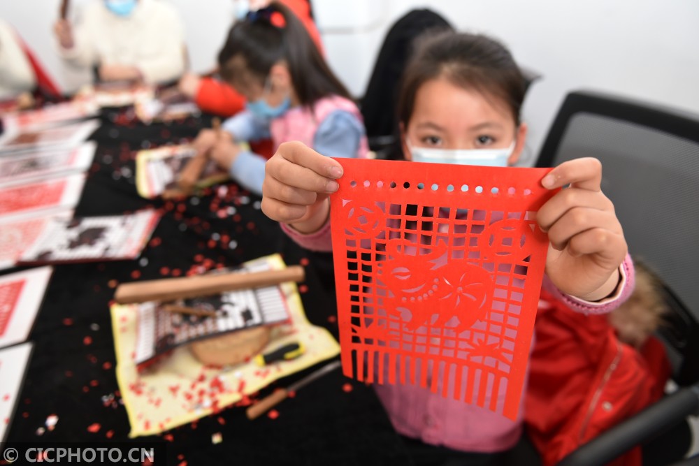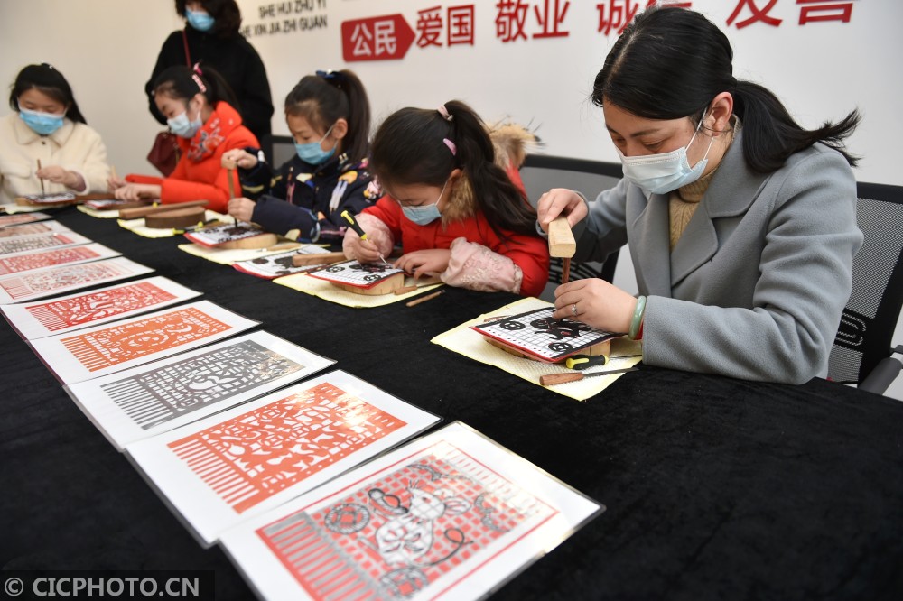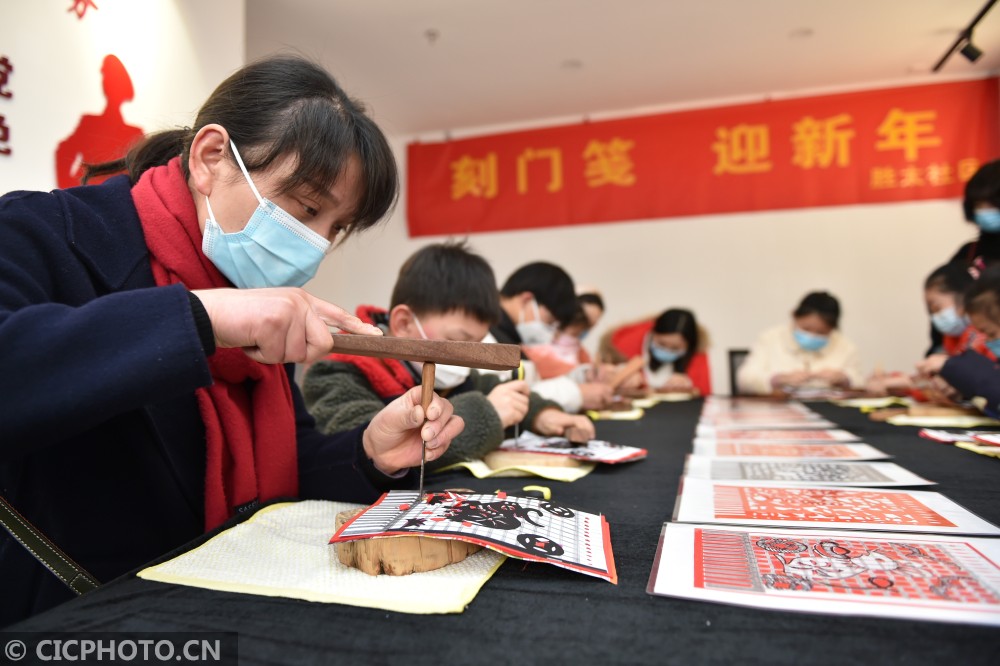 2021年1月31日,江苏省南京市江宁区秣陵街道胜太社区举办“刻门笺迎新年”活动,社区居民用红纸、刻刀、木槌、剪刀等工具自己动手刻制牛年门笺,感受中国传统文化,喜气洋洋迎新春。