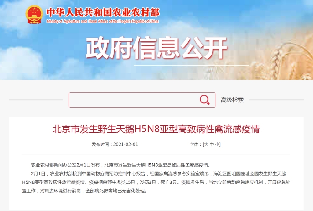 农业农村部新闻办公室2月1日发布,北京市发生野生天鹅H5N8亚型高致病性禽流感疫情。