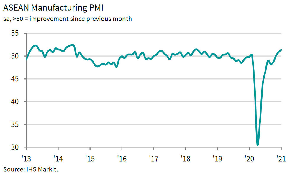 IHS Markit经济学家路易斯·库帕(Lewis Cooper)表示,2021年1月,东盟国家制造业的健康状况连续第二个月改善。总的来说,1月的PMI数据对制造业来说是好消息,表明复苏终于开始了。但是,东盟各国制造业的情况仍然不平衡,其原因在于更严格的封锁措施抑制了一些国家的需求。但是,如果目前的封锁措施能在遏制疫情方面取得成功,随着疫苗的推广和相关措施的全面放松,整个东盟国家制造业应该能够得到进一步扩张。