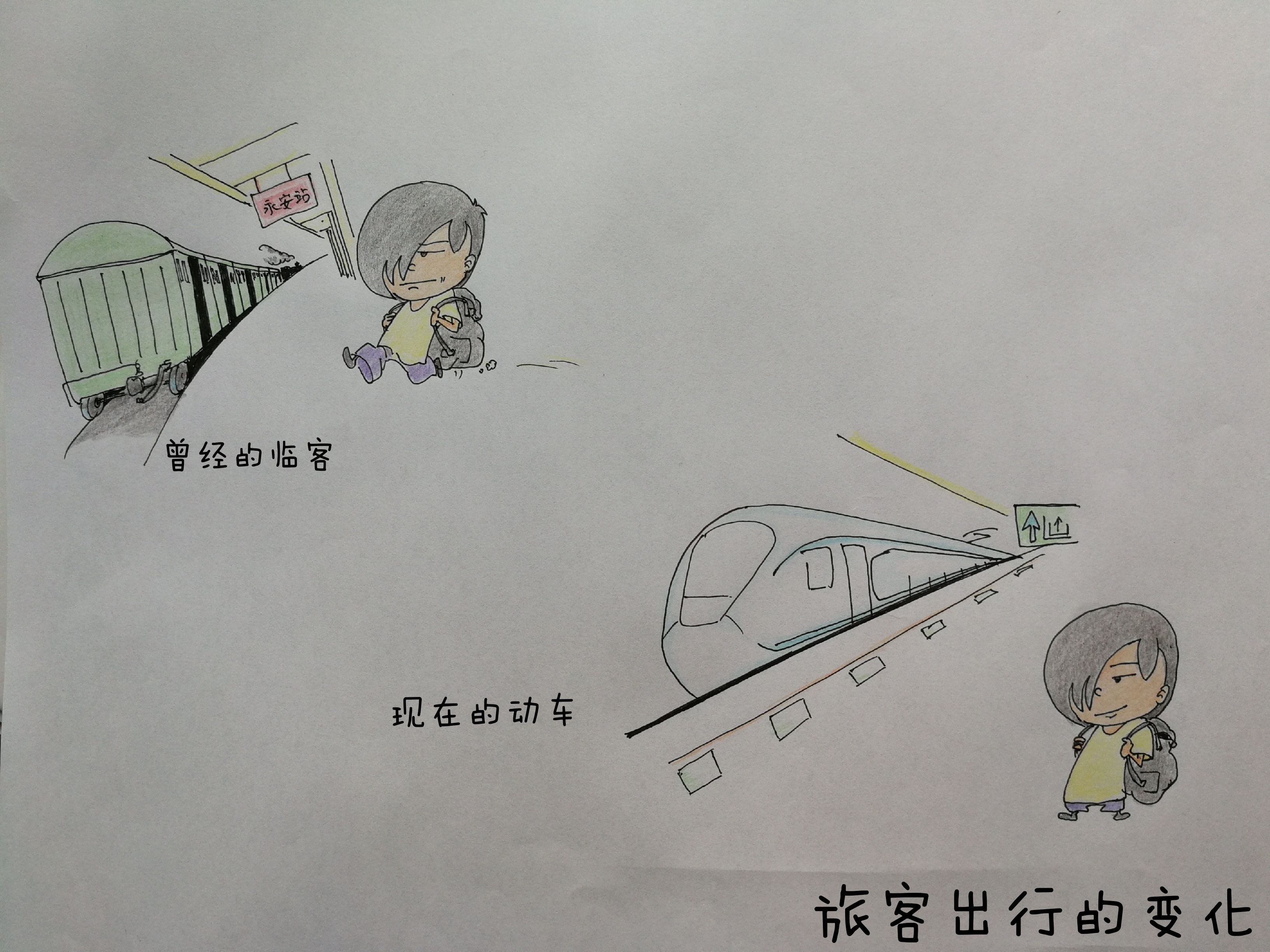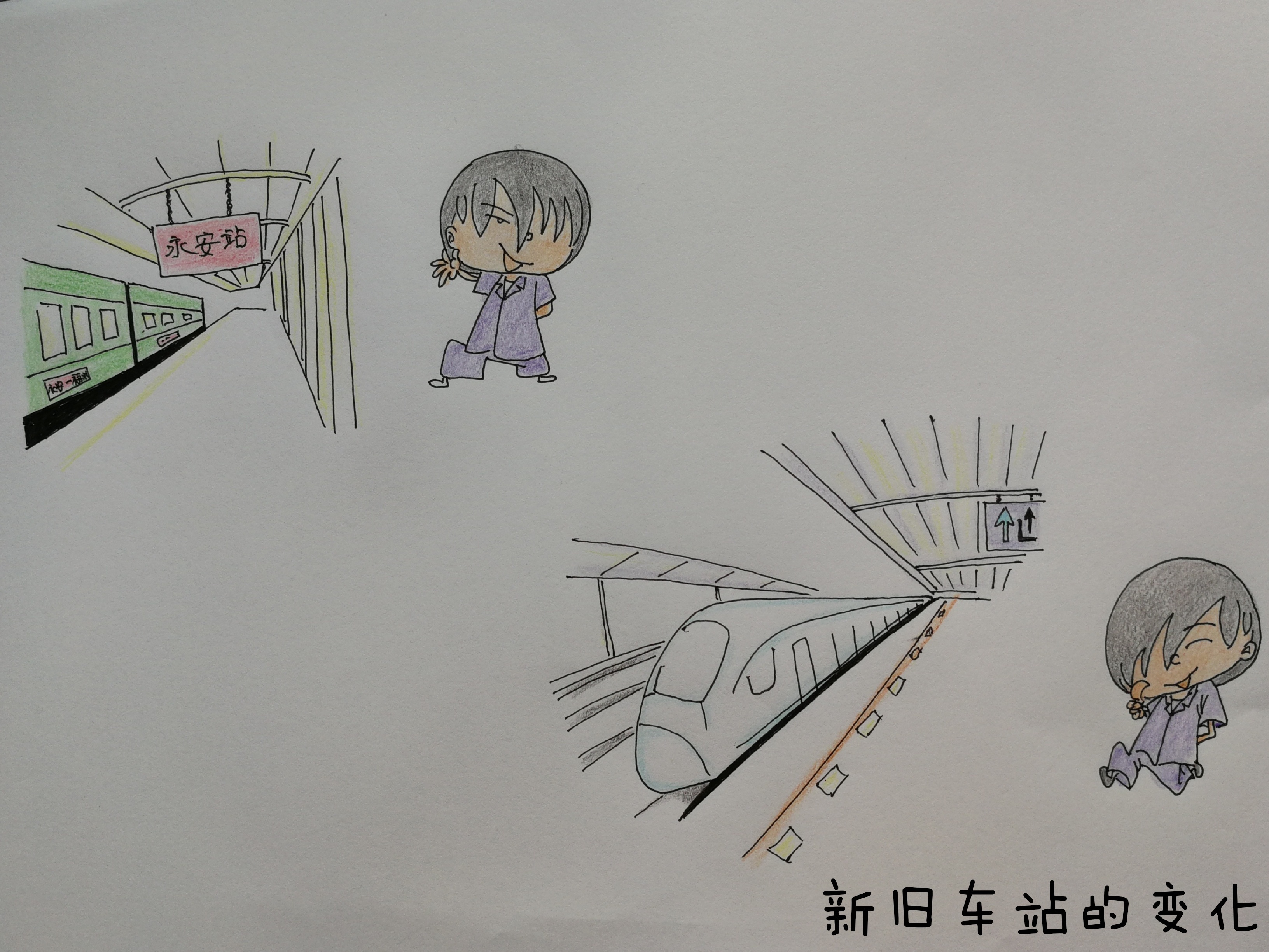 “因为亲身经历,所以体会更深,画这些漫画的时候几乎信手捏来。”林金钰指着一副漫画说,“这是鹰厦线上老的永安站,这是南龙铁路上新的永安南站,两个漫画放在一起对比非常强烈,一个是矮矬破,一个是高大上。”