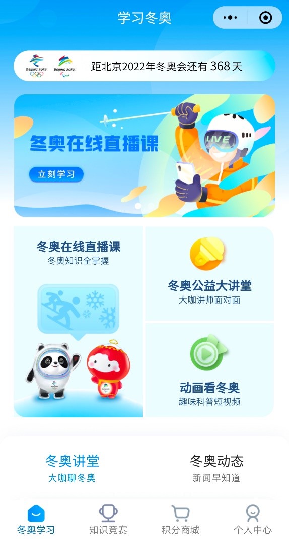 “学习冬奥”微信小程序是面向社会公众进行知识传播的网络平台。采取开设在线直播课、制作卡通短片、应用VR技术、开展趣味答题等形式,增强社会公众获得冬奥知识资源的便捷性和趣味性,促进冬奥知识普及与冰雪运动发展。