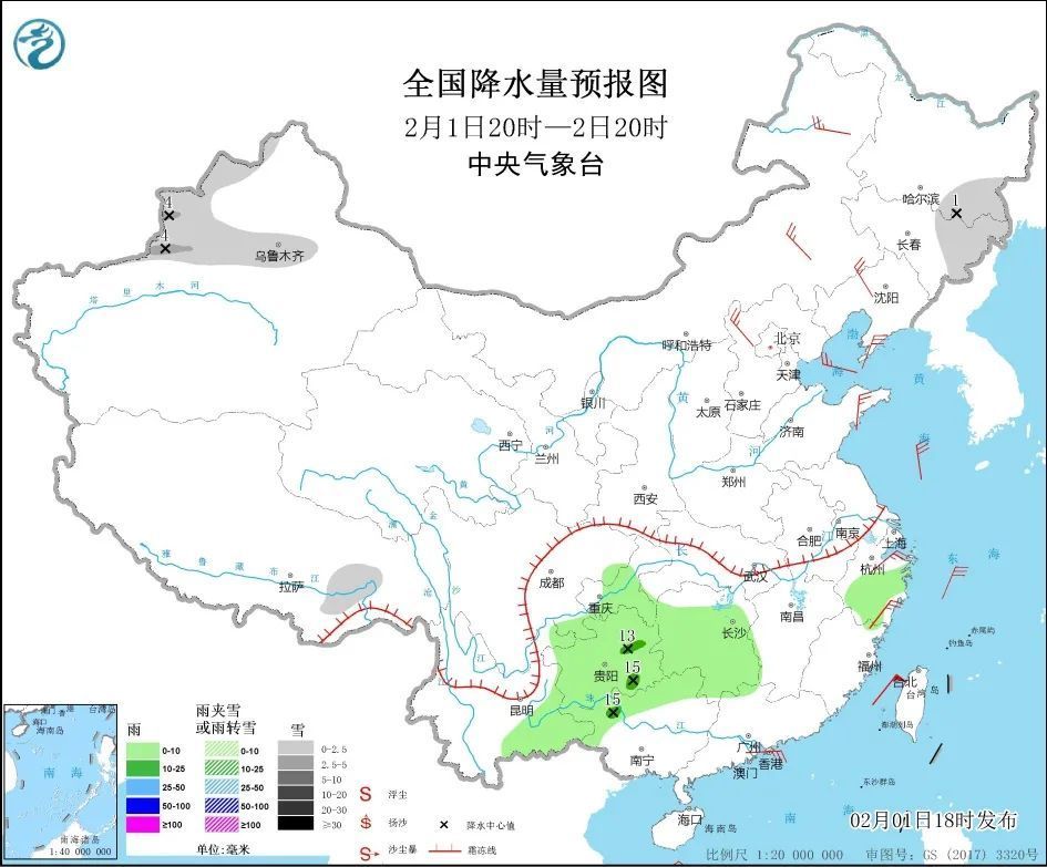 2月1日20时至2日20时,黑龙江东南部、吉林东部、新疆沿天山地区和伊犁河谷、西藏东南部等地的部分地区有小到中雪。江南东部和西部、西南地区东部、云南东南部、华南西北部等地的部分地区有小到中雨。
