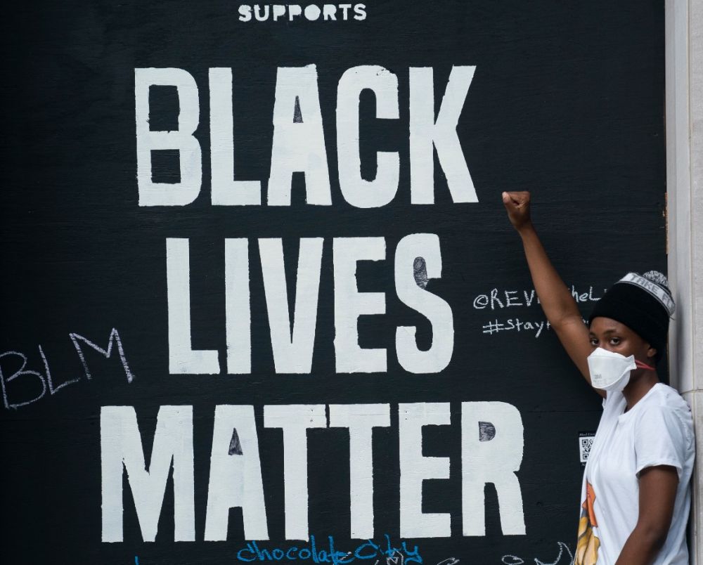 2020年6月19日,在美国首都华盛顿白宫附近,一名女孩参加集会游行期间与墙上的标语“黑人的命也是命”合影。(新华社记者刘杰摄)