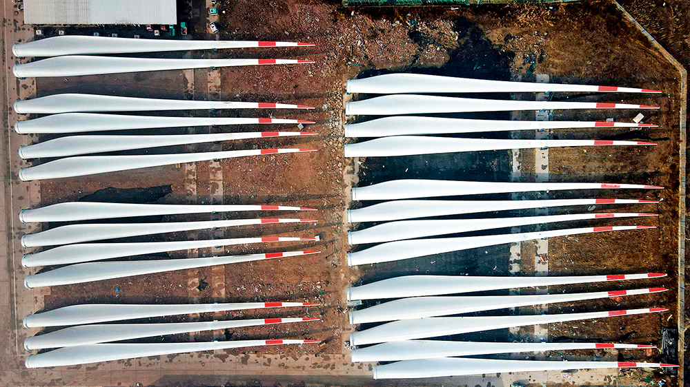 河北省威县一家风电设施生产企业内的大型风电机组叶片(2020年12月8日摄) 牟宇摄/本刊