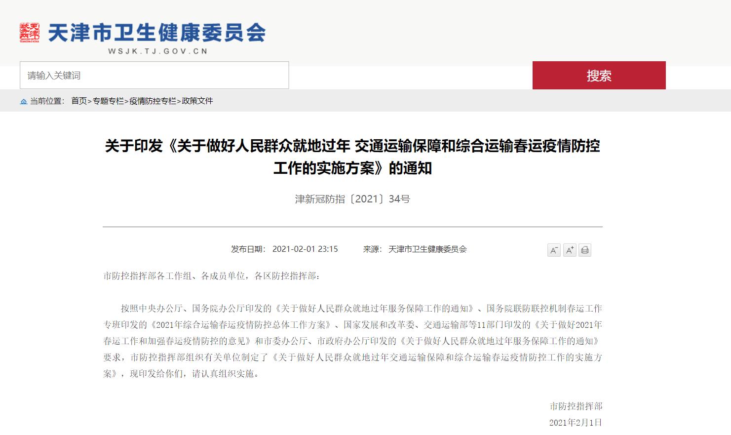 为了保障群众安心就地过年,2月1日,天津市防控指挥部印发《关于做好人民群众就地过年交通运输保障和综合运输春运疫情防控工作的实施方案》,发布交通物资保障、留津过年大礼包,并出台一系列最新防控政策。