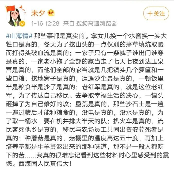 《山海情》的成功,让那些以戏说、宫斗,无脑、泡沫甩锅观众喜好的人傻眼,让那些追求离奇、刺激、天马行空“手撕鬼子”,不触碰现实,动辄甩锅“禁忌”的人闭嘴。观众看得懂深沉的民族记忆,会在真实的人生悲喜里有哭有笑,可以接受社会发展的循序渐进,能够在富足后同情弱者,心怀未来。只是这样的剧作,对观众来说还嫌太少。