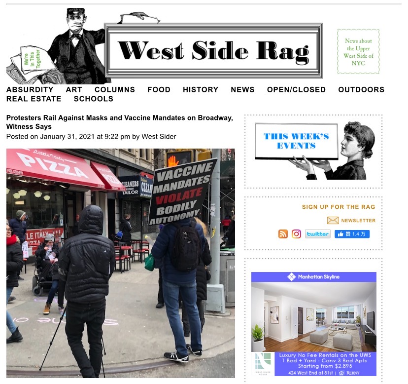 美国媒体《西城小报》1月31日报道,一组抗议人员聚集在百老汇路段,斥责口罩和疫苗