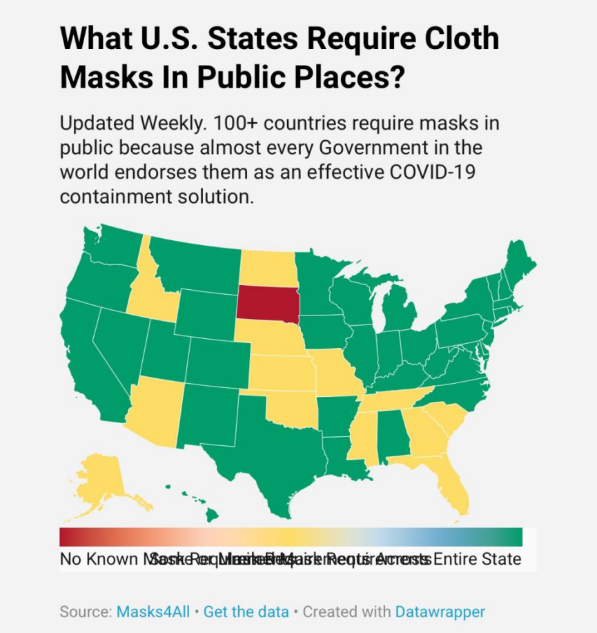 △全民口罩网统计,绿色为全州范围实行口罩强制,黄色为州内部分地区实行口罩强制令,红色(南达科他州)为完全没有任何相关禁令