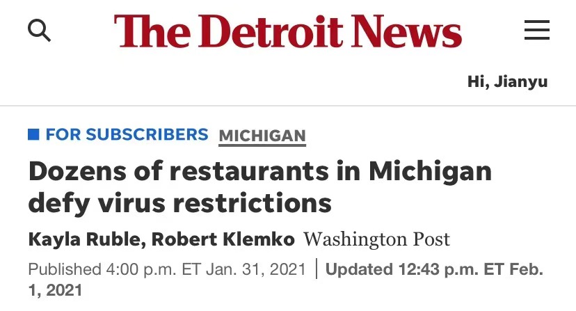 △《底特律时报》1月31日报道,密歇根州十几家餐厅完全蔑视防疫禁令