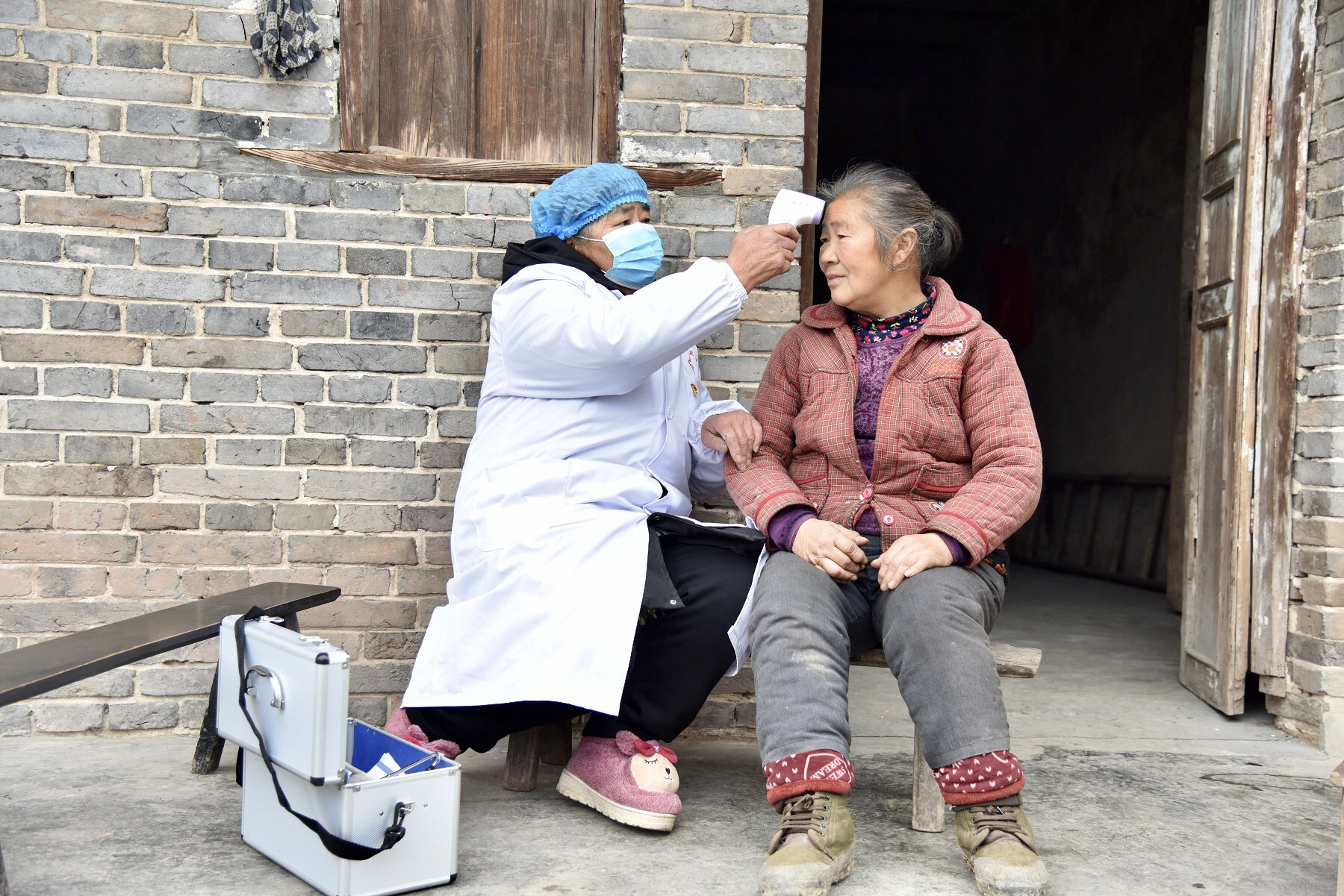 陈述芳为村民测量体温,帮助群众做好健康监测。新华社记者柯高阳摄