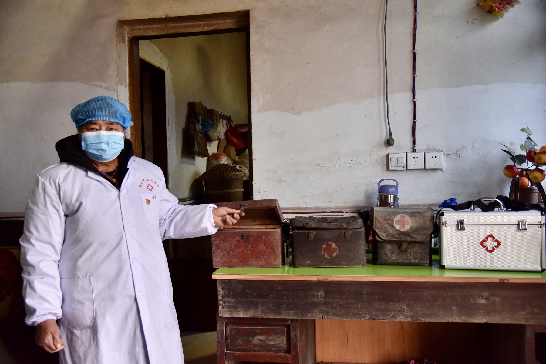 陈述芳展示从20世纪60年代以来使用过的四代“医疗箱”。她说,现在村卫生室的条件越来越好,新款的医疗箱轻便又好用。新华社记者柯高阳摄