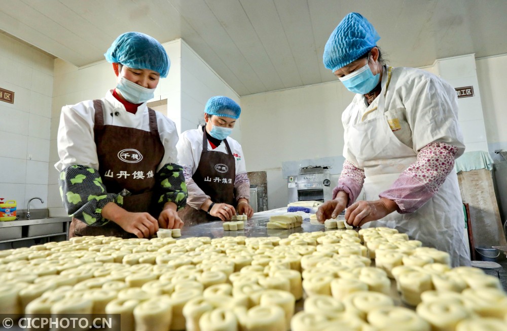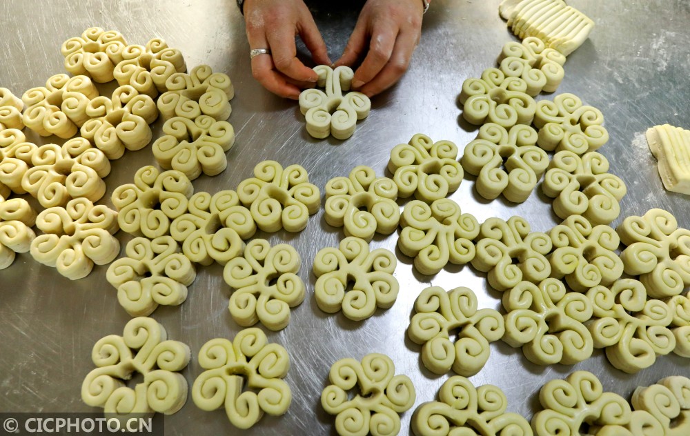 ↑2021年2月1日,甘肃省张掖市山丹县山丹馍馍制作车间,工作人员将面饼翻出图案花状。CICPHOTO/王将 摄