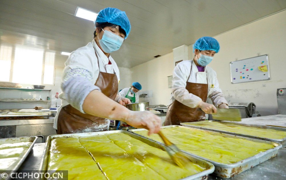 ↑2021年2月1日,甘肃省张掖市山丹县山丹馍馍制作车间,工作人员在检验制作好的“糖花子”。CICPHOTO/王将 摄