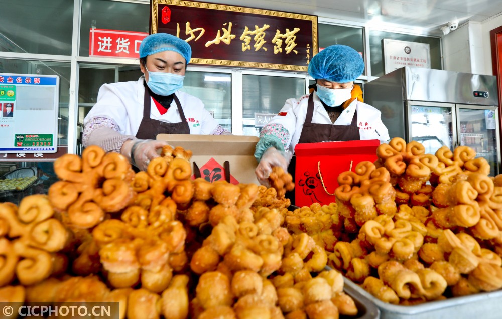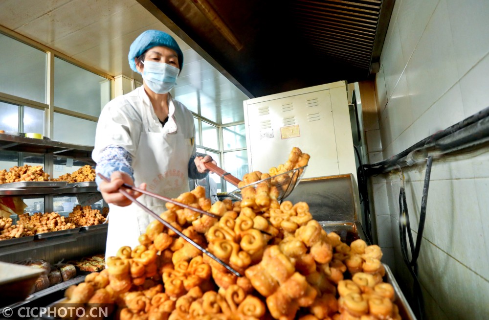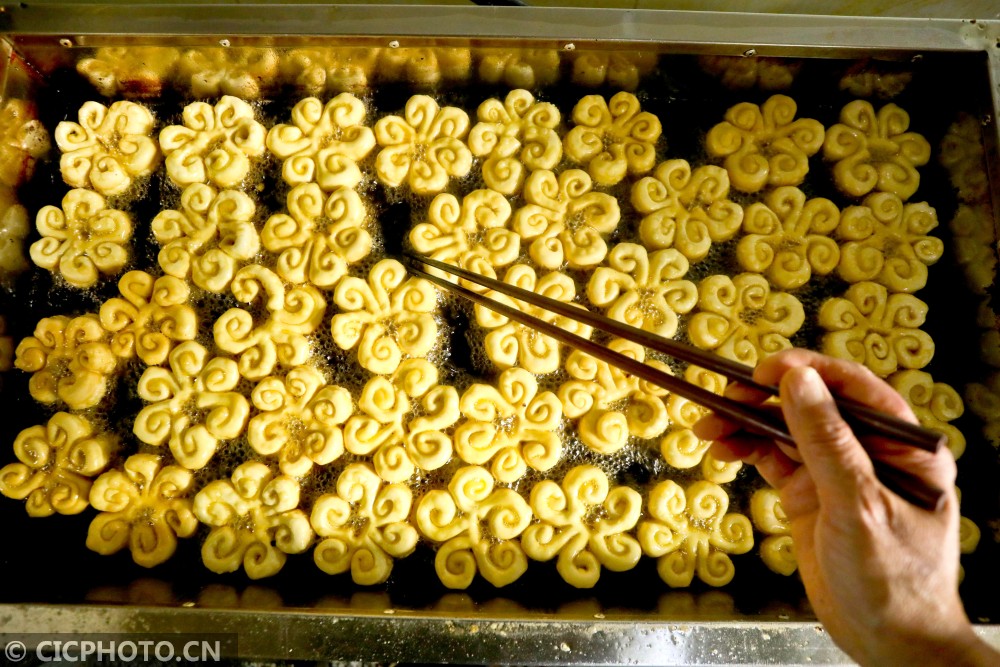 ↑2021年2月1日,甘肃张掖山丹县山丹馍馍制作车间里,工作人员将煎炸好的“糖花子”从油锅中捞出。CICPHOTO/王将 摄