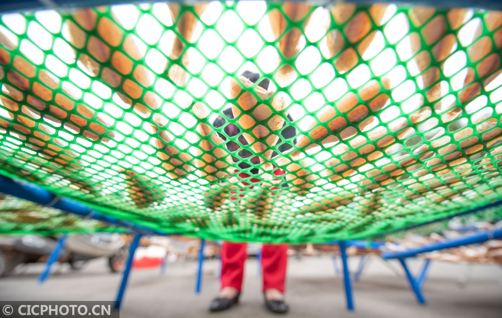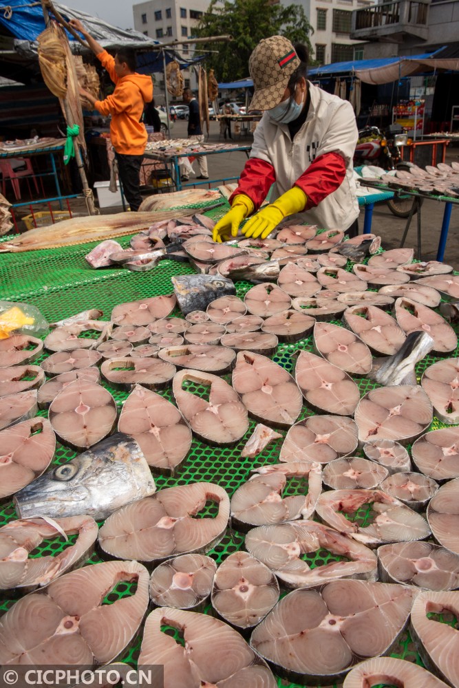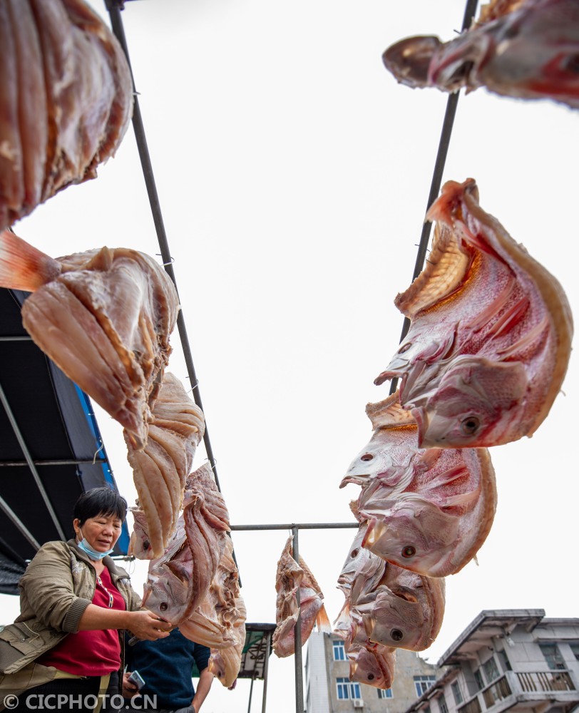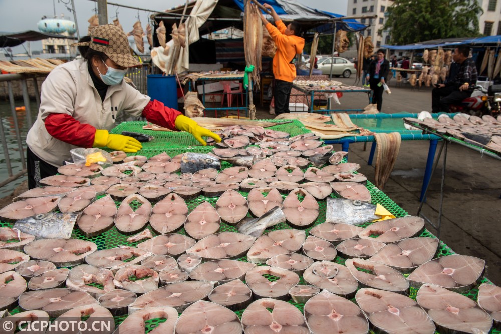 ↑2021年1月30日,渔民在海南省文昌市铺前镇码头晾晒鱼干。CICPHOTO/蒙钟德 摄