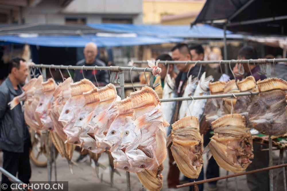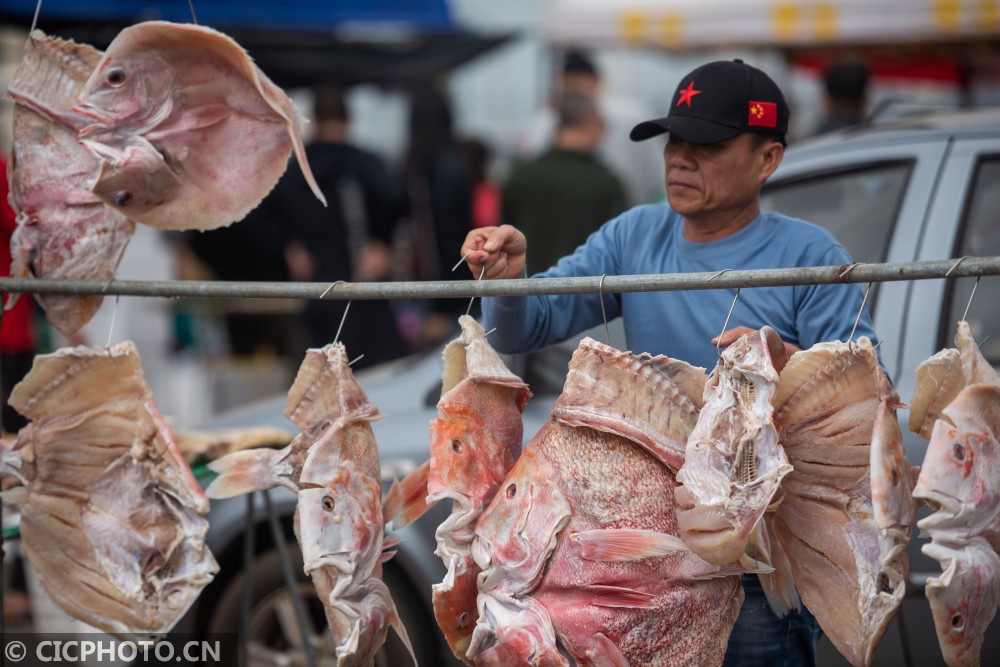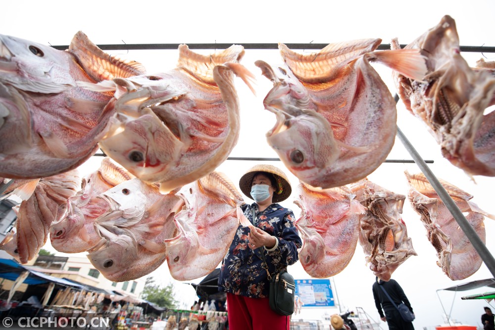 ↑2021年1月30日,游客在海南省文昌市铺前镇码头选购鱼干。CICPHOTO/蒙钟德 摄