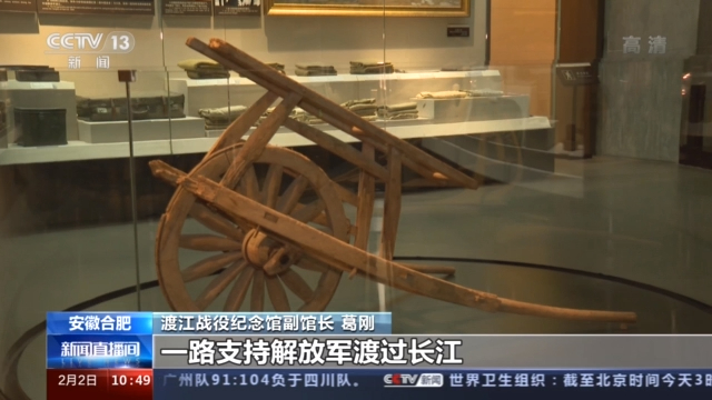 渡江战役纪念馆副馆长 葛刚:渡江战役时期,群众就是推着这样的小推车,运送粮食、柴草等后勤物资,一路跟随解放军,一路支持解放军渡过长江。